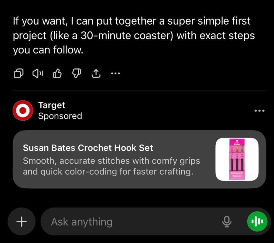 About one out of every five questions in a new conversation thread triggered an ad at the bottom of the chatbot’s output.