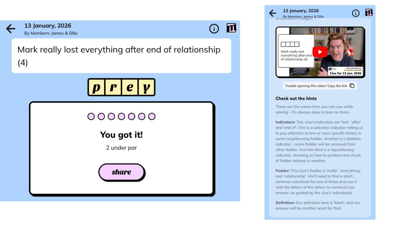 But friendly puzzles like Minute Cryptic and Parsewords help you learn the little tricks of the trade, and after playing them daily for a while, I can now often answer cryptic clues without hints.